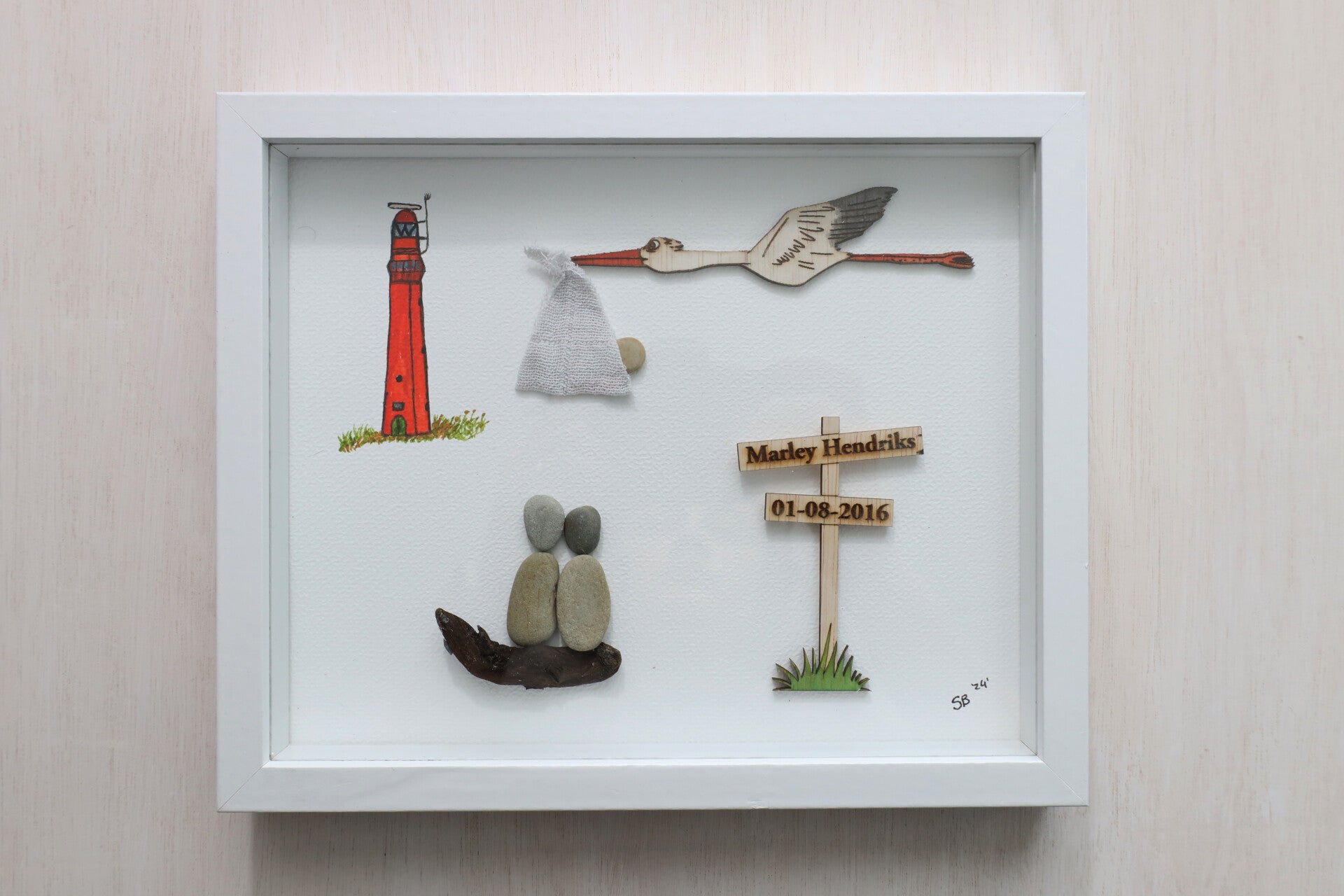Elk steenschilderij is uniek. Alle steentjes en stukjes hout die verwerkt worden in de schilderijen zijn gevonden op Schiermonnikoog.