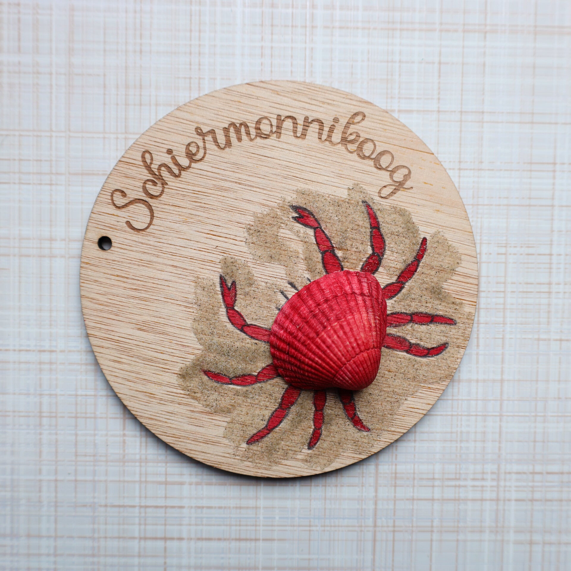Krab gemaakt van een schelp op een houten rondje van 10cm doorsnee. Leuk om op te hangen of neer te leggen.Elke variant is uniek omdat ze met de hand gemaakt worden van schelpen die gevonden zijn op het brede strand van Schiermonnikoog.