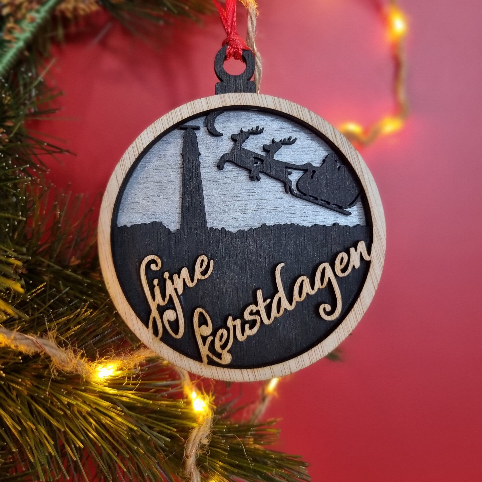 Deze kerstbal bestaat uit 3 lagen hardhout triplex. Hij is 9cm breed en 1,2cm dik.